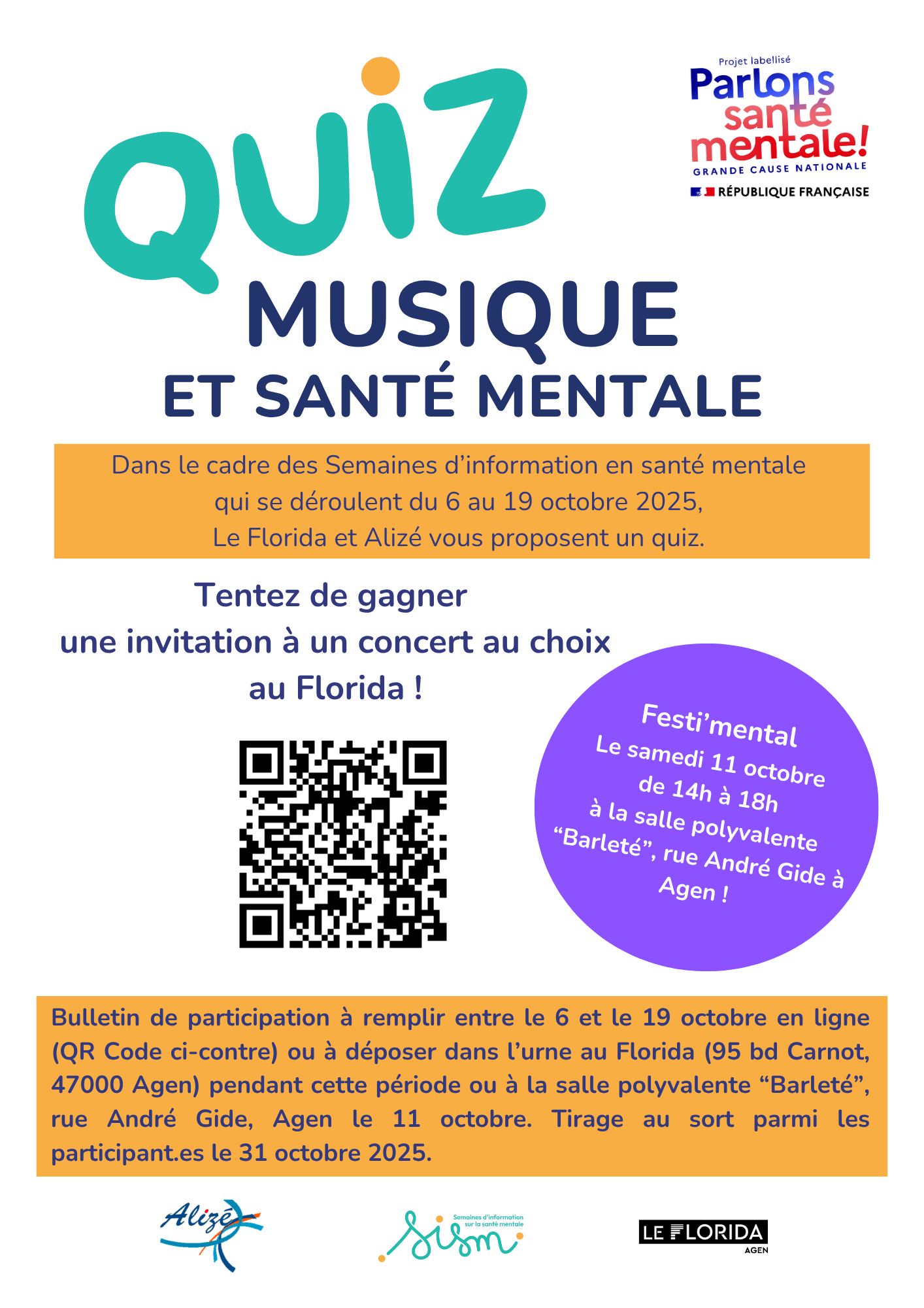Dans le cadre des Semaines d’information en santé mentale, Alizé et le Florida vous proposent un quiz. Des invitations aux concerts du Florida sont à gagner !